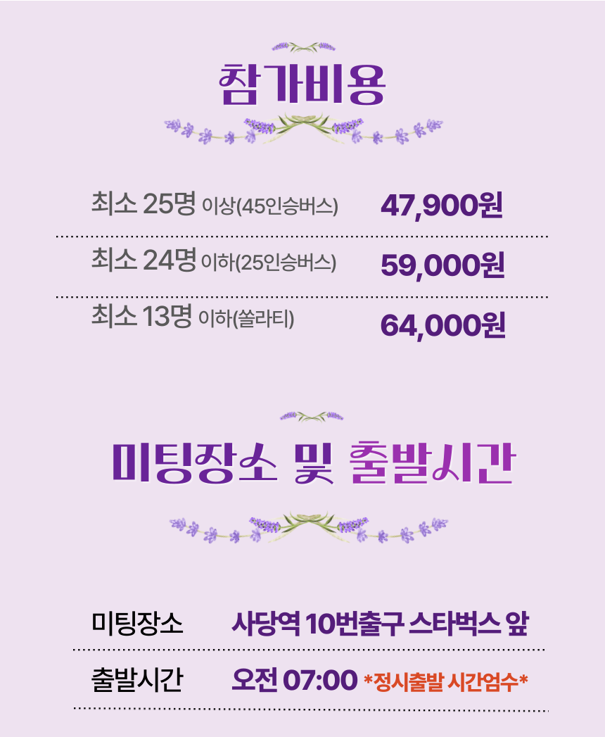 • * 출발 인원 13명 이하 시: 쏠라티(64,000원) * 출발 인원 24명 이하 시: 25인승 버스(59,000원) * 출발 인원 25명 이상 시: 45인승 버스(47,900원)