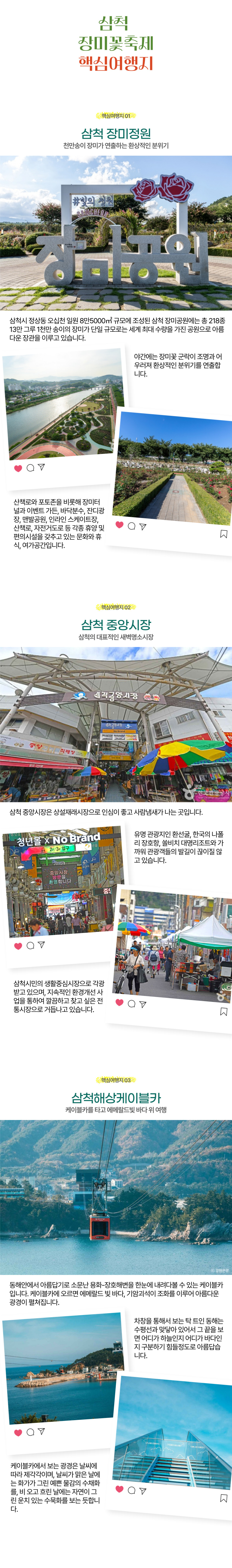 <핵심포인트> (1) 수백만 장미꽃이 만발한 장관 (2) 삼척중앙시장에서 입맛에 맞게 자유로운 중식 (3) 알찬 일정으로 해상 케이블카 또는 강원종합박물관까지