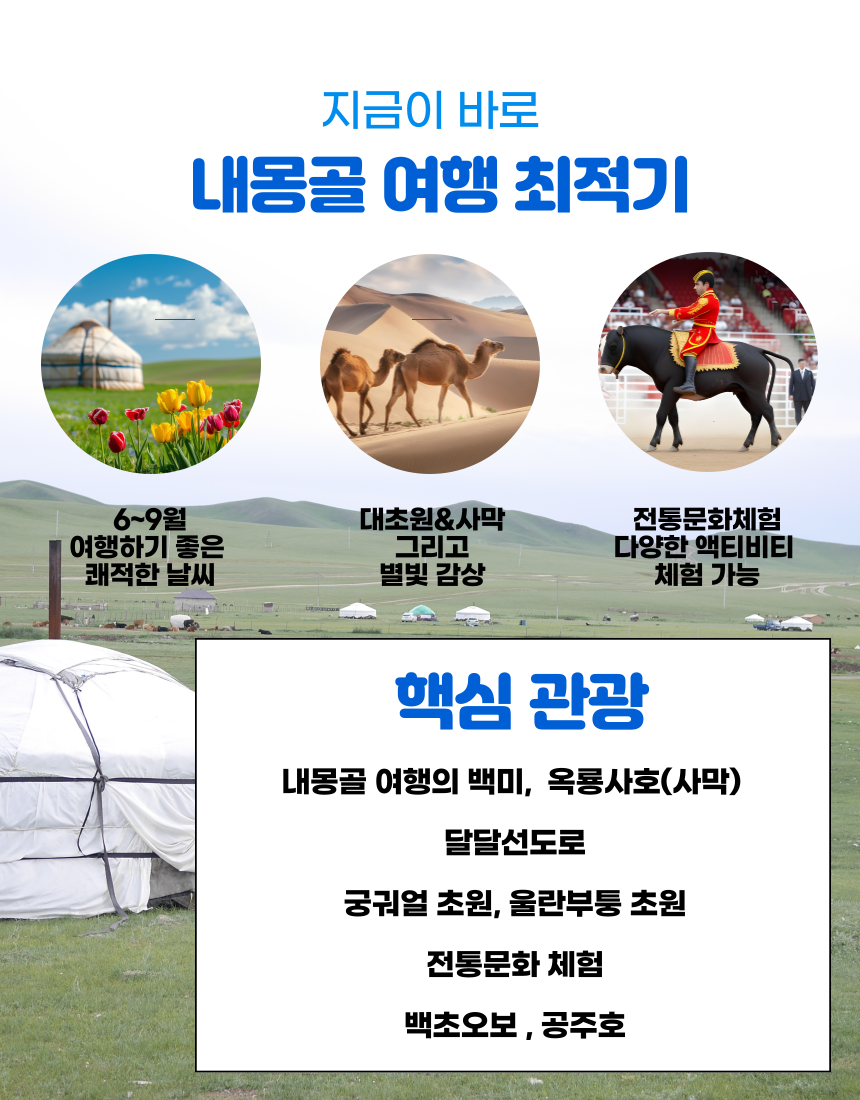 - 몽골은 의료시설이 열악하고 여름철 성수기 항공편 좌석 확보가 어려우므로 안전사고를 당할 경우 큰 위험에 처할 수 있으니 항상 안전에 신경써 주실 것을 당부 드림